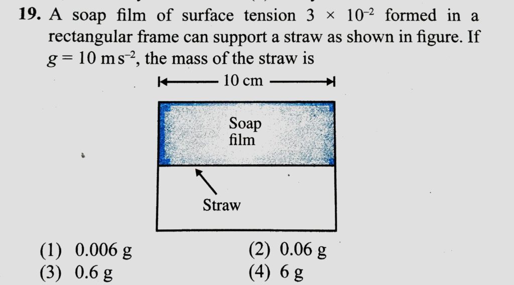 A soap flim of surface tension 3 x 10^-2 formed in a rectangular frame can support a straw as shown in figure. If g = 10 m/s^2, the mass of the straw is A soap flim of surface tension 3 x 10^-2 formed in a rectangular frame can support a straw as shown in figure. If g = 10 m/s^2 the mass of the straw is October 11, 2020 Category: Uncategorised (JEE Advanced Physics by BM Sharma + GMP Solutions) , Facebook Messenger WhatsApp Share this:TwitterFacebook Related