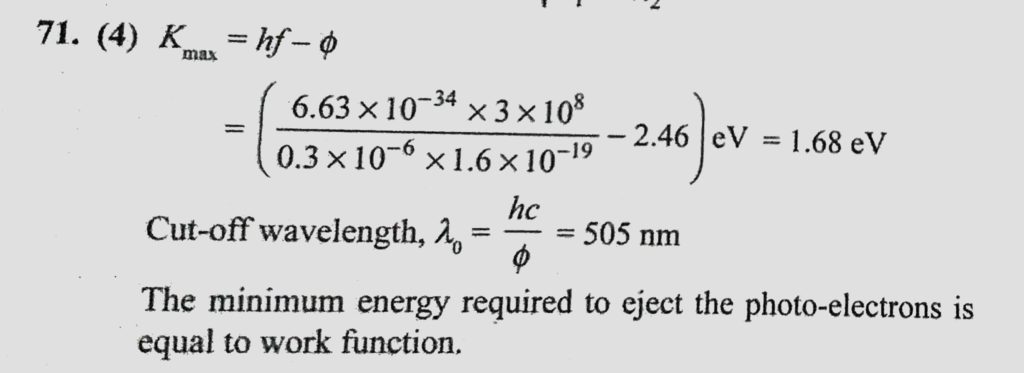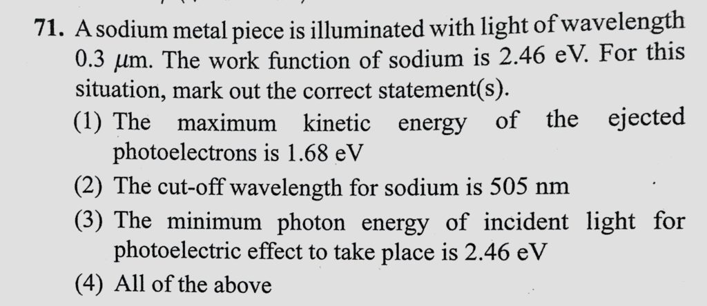A sodium metal piece is illuminated with light of wavelength 0.3 mu m. The work function of sodium is 2.46 eV. For this situation, mark out the correct statement(s). A sodium metal piece is illuminated with light of wavelength 0.3 mu m. The work function of sodium is 2.46 eV. For this situation mark out the correct statements. October 14, 2020 Category: Uncategorised (JEE Advanced Physics by BM Sharma + GMP Solutions) , Facebook Messenger WhatsApp Share this:TwitterFacebook Related
