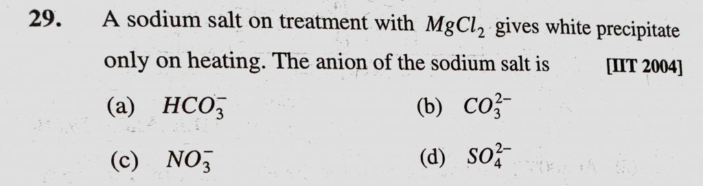A sodium salt on treatment with MgCl2 gives white precipitate only on heating. The anion of the sodium salt is (a) HCO3- (b) CO3 2- (c) NO3 – (d) SO4 2- A sodium salt on treatment with MgCl2 gives white precipitate only on heating. The anion of the sodium salt is (a) HCO3- (b) CO3 2- (c) NO3 - (d) SO4 2- November 12, 2020 Category: Uncategorised (JEE Advanced Physics by BM Sharma + GMP Solutions) , Facebook Messenger WhatsApp Share this:TwitterFacebook Related