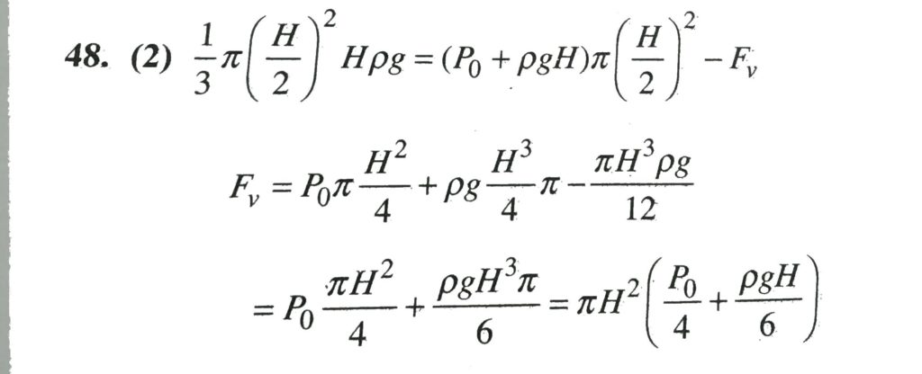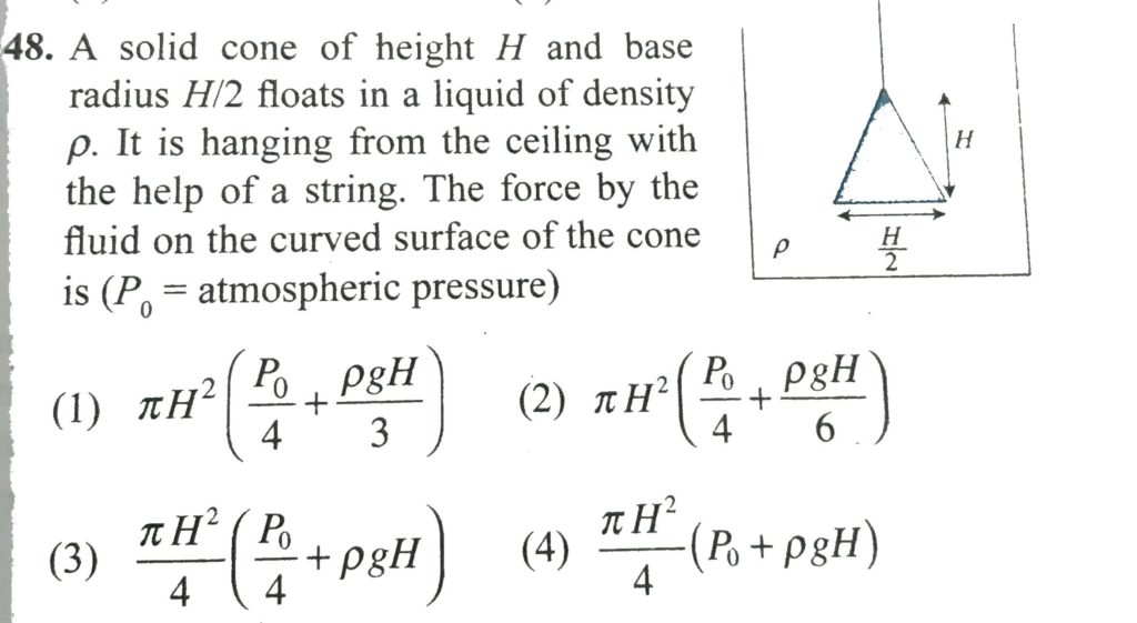 A solid cone of height H and base radius H/2 floats in a liquid of density ρ. It is hanging from the ceiling with the help of a string. The force by the fluid on the curved surface of the cone is (P0= atmospheric pressure) determine the value of acceleration a so that pressure at point A becomes equal to p0/2? (p0 is the atmospheric pressure) For the L-shaped vessel shown in the figure October 7, 2020 Category: Uncategorised (JEE Advanced Physics by BM Sharma + GMP Solutions) , Facebook Messenger WhatsApp Share this:TwitterFacebook Related