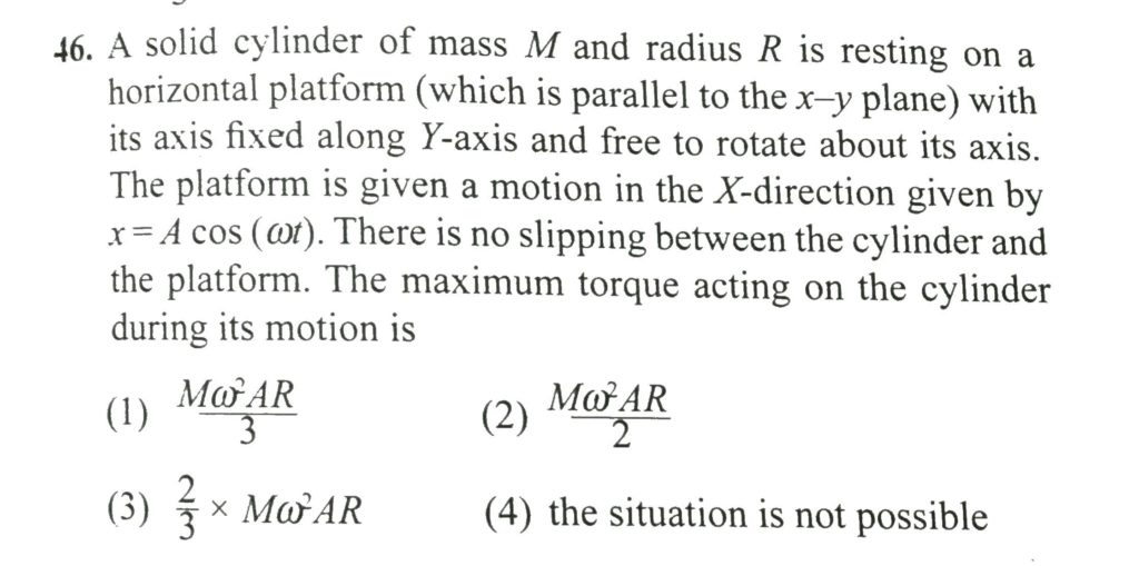 A solid cylinder of mass M and radius R is resting on a horizontal platform (which is parallel to the x-y plane) with its axis fixed along Y-axis and free to rotate about its axis. The platform is given a motion in the X-direction given by x=Acos(ωt). There is no slipping between the cylinder and the platform. The maximum torque acting on the cylinder during its motion is: