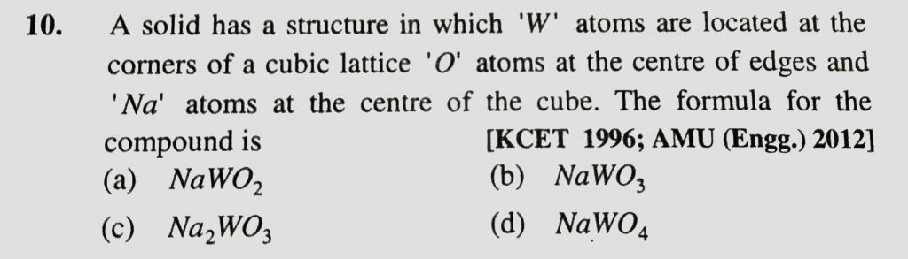 A solid has structure in which ‘W’ atoms are located at the corners of a cubic lattice ‘O’ atoms at the centre of the edges and ‘Na’ atoms at the centres of the cube. The formula for the compound is A solid has structure in which 'W' atoms are located at the corners of a cubic lattice 'O' atoms at the centre of the edges and 'Na' atoms at the centres of the cube. The formula for the compound is February 9, 2021 Category: Uncategorised (JEE Advanced Physics by BM Sharma + GMP Solutions) , Facebook Messenger WhatsApp Share this:TwitterFacebook Related