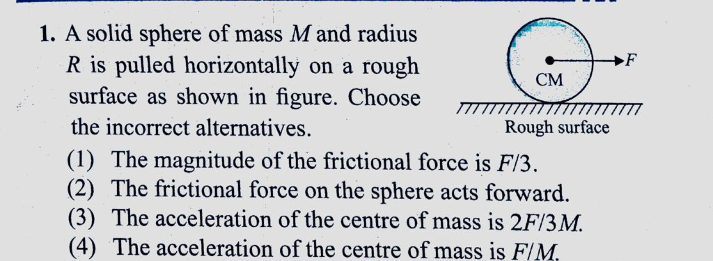 A solid sphere of mass M and radius R is pulled horizontally on a rough surface as shown in figure. Choose the incorrect alternatives. A solid sphere of mass M and radius R is pulled horizontally on a rough surface as shown in figure. Choose the incorrect alternatives. September 30, 2020 Category: Uncategorised (JEE Advanced Physics by BM Sharma + GMP Solutions) , Facebook Messenger WhatsApp Share this:TwitterFacebook Related