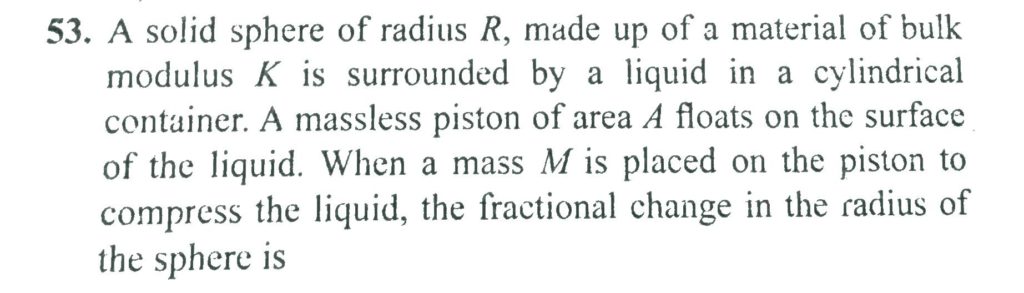 A solid sphere of radius R made of a material of bulk modulus K is surrounded by a liquid in cylindrical container. A massless piston of area A floats on the surface of the liquid. When a mass M is placed on the piston to compress the liquid, the fractional change in the radius of the sphere, is