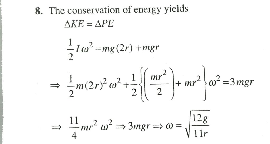 A solid uniform disk of mass m and radius R is pivoted about a horizontal axis through its centre and a small body of mass m is attached to the rim of the disk. If the disk is released from rest with the small body, initially at the same level as the centre, the angular velocity when the small body reaches the lowest point of the disk is.