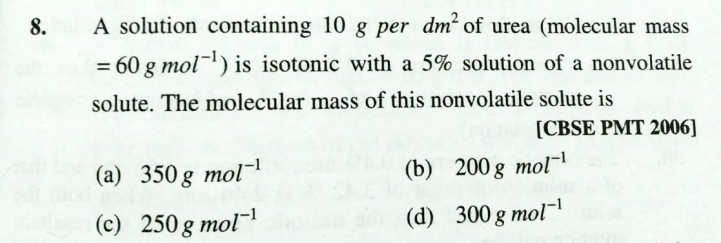 A solution cpontaining 10 g per dm^2 of urea ( molecular mass = 60 g/mol ) is isotonic with a 5% solution of a non volatile solute. The molecular mass of this nonvolatile solute is A solution cpontaining 10 g per dm^2 of urea ( molecular mass = 60 g/mol ) is isotonic with a 5% solution of a non volatile solute. The molecular mass of this nonvolatile solute is December 13, 2020 Category: Uncategorised (JEE Advanced Physics by BM Sharma + GMP Solutions) , Facebook Messenger WhatsApp Share this:TwitterFacebook Related