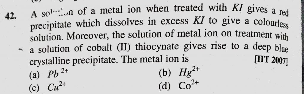 A solution of a metal ion when treated with KI gives a red precipitate which dissolves in excess KI to give a colourless solution. Moreover, the solution of metal ion on treatment with A solution of a metal ion when treated with KI gives a red precipitate which dissolves in excess KI to give a colourless solution. Moreover the solution of metal ion on treatment with December 8, 2020 Category: Uncategorised (JEE Advanced Physics by BM Sharma + GMP Solutions) , Facebook Messenger WhatsApp Share this:TwitterFacebook Related