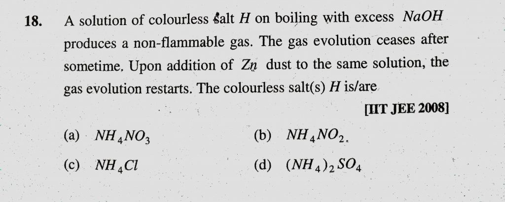 A solution of colourless salt H on boiling with excess NaOH produces a non-flammable gas. The gas evolution ceases after sometime. Upon addition of Zn dust to the same solution, the gas evolution restarts. The colourless salt(s) H is/are A solution of colourless salt H on boiling with excess NaOH produces a non-flammable gas. The gas evolution ceases after sometime. Upon addition of Zn dust to the same solution the gas evolution restarts. The colourless salt(s) H is/are November 28, 2020 Category: Uncategorised (JEE Advanced Physics by BM Sharma + GMP Solutions) , Facebook Messenger WhatsApp Share this:TwitterFacebook Related