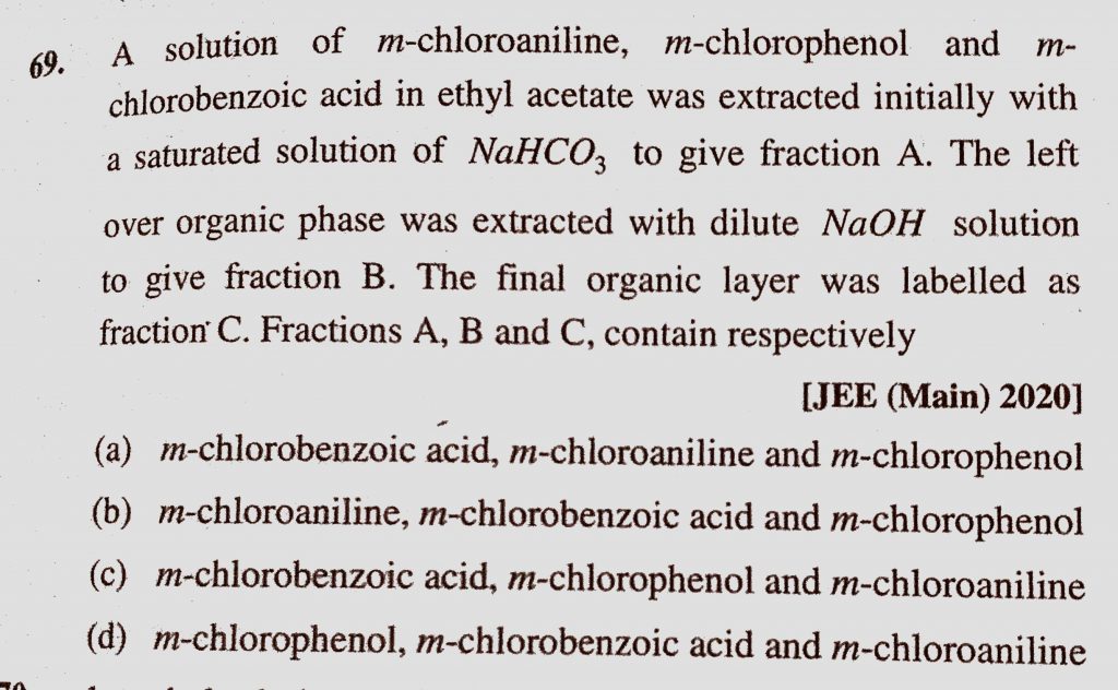 A solution of m-chloroaniline, m-chlorophenol and m-chlorobenzoic acid in ethyl acetate was extracted initially with a saturated solution of NaHCO3 to give fraction A. The left A solution of m-chloroaniline m-chlorophenol and m-chlorobenzoic acid in ethyl acetate was extracted initially with a saturated solution of NaHCO3 to give fraction A. The left February 9, 2021 Category: Uncategorised (JEE Advanced Physics by BM Sharma + GMP Solutions) , Facebook Messenger WhatsApp Share this:TwitterFacebook Related