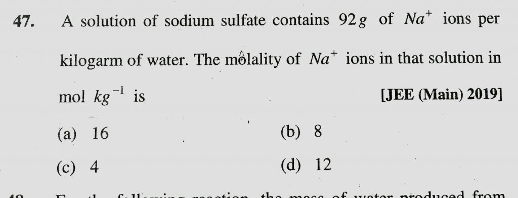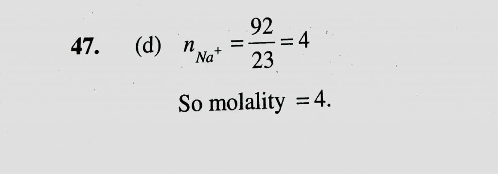 A solution of sodium sulfate contains 92 g of Na^+ ions per kilogram of water. The molality of Na^+ ions in that solution in mol/kg is A solution of sodium sulfate contains 92 g of Na^+ ions per kilogram of water. The molality of Na^+ ions in that solution in mol/kg is November 25, 2020 Category: Uncategorised (JEE Advanced Physics by BM Sharma + GMP Solutions) , Facebook Messenger WhatsApp Share this:TwitterFacebook Related