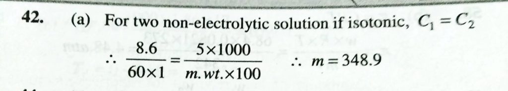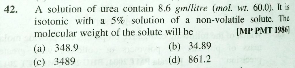 A solution of urea contain 8.6 gm/litre (mol. wt. 60.0). If is isotonic with a 5% solution of a non-volatile solute. The molecular weight of the solute will be A solution of urea contain 8.6 gm/litre (mol. wt. 60.0). If is isotonic with a 5% solution of a non-volatile solute. The molecular weight of the solute will be December 13, 2020 Category: Uncategorised (JEE Advanced Physics by BM Sharma + GMP Solutions) , Facebook Messenger WhatsApp Share this:TwitterFacebook Related