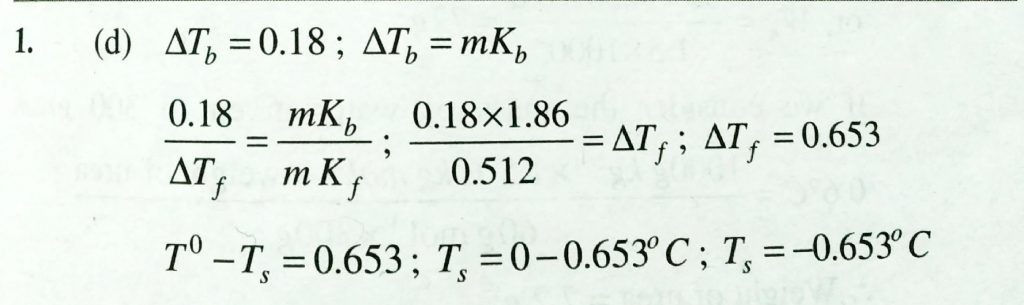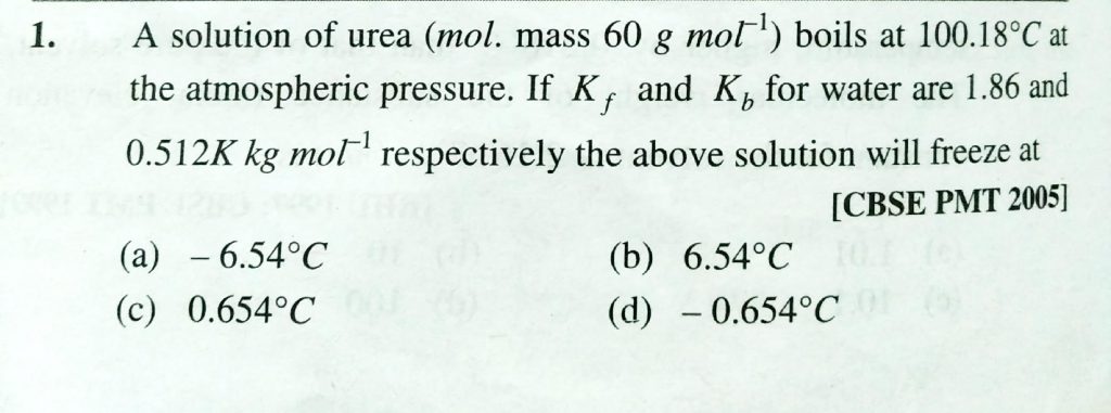 A solution of urea (mol. Mass 60 g/mol ) boils of 100.18∘C at one one atmospheric pressure. If kf and Kb for water are 1.86 and 0.512 K kg/ mol respectively, the above solution will freeze at: A solution of urea (mol. Mass 60 g/mol ) boils of 100.18∘C at one one atmospheric pressure. If kf and Kb for water are 1.86 and 0.512 K kg/ mol respectively the above solution will freeze at: December 14, 2020 Category: Uncategorised (JEE Advanced Physics by BM Sharma + GMP Solutions) , Facebook Messenger WhatsApp Share this:TwitterFacebook Related