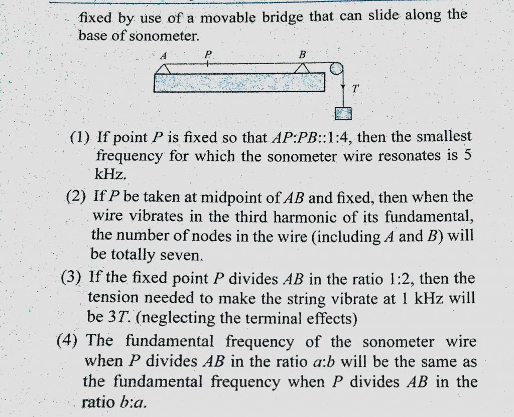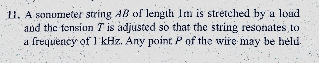 A sonometer string AB of length 1 m is stretched by a load and the tension T is adjusted so that the string resonates to a frequency of 1 kHz. Any point P of the wire may be held A sonometer string AB of length 1 m is stretched by a load and the tension T is adjusted so that the string resonates to a frequency of 1 kHz. Any point P of the wire may be held November 6, 2020 Category: Uncategorised (JEE Advanced Physics by BM Sharma + GMP Solutions) , Facebook Messenger WhatsApp Share this:TwitterFacebook Related