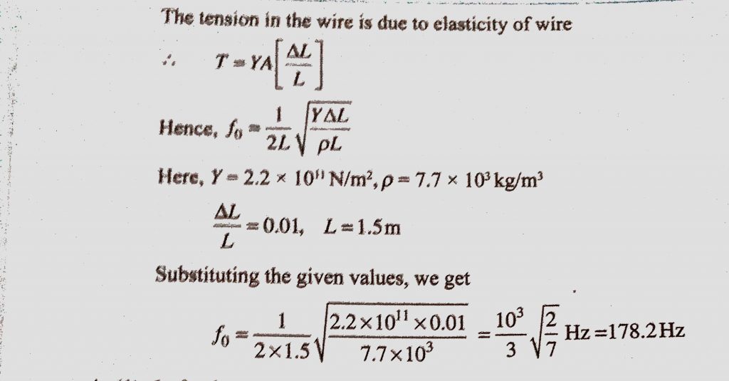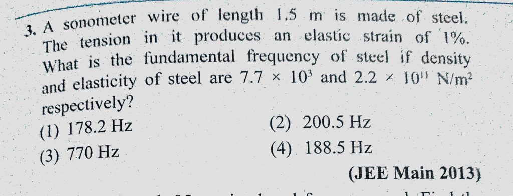 A sonometer wire of length 1.5 m is made of steel. The tension in it produces an elastic strain of 1%. What is the fundamental frequency of steel if density and elasticity of steel A sonometer wire of length 1.5 m is made of steel. The tension in it produces an elastic strain of 1%. What is the fundamental frequency of steel if density and elasticity of steel November 7, 2020 Category: Uncategorised (JEE Advanced Physics by BM Sharma + GMP Solutions) , Facebook Messenger WhatsApp Share this:TwitterFacebook Related