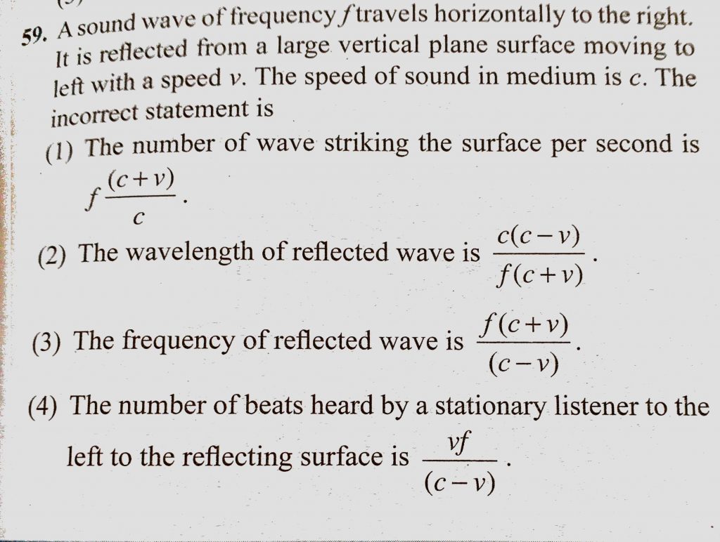 A sound wave of frequency f travels horizontally to the right. It is reflected from a large vertical plane surface moving to left with a speed v. The speed of sound in medium is c. The incorrect A sound wave of frequency f travels horizontally to the right. It is reflected from a large vertical plane surface moving to left with a speed v. The speed of sound in medium is c. The incorrect November 8, 2020 Category: Uncategorised (JEE Advanced Physics by BM Sharma + GMP Solutions) , Facebook Messenger WhatsApp Share this:TwitterFacebook Related
