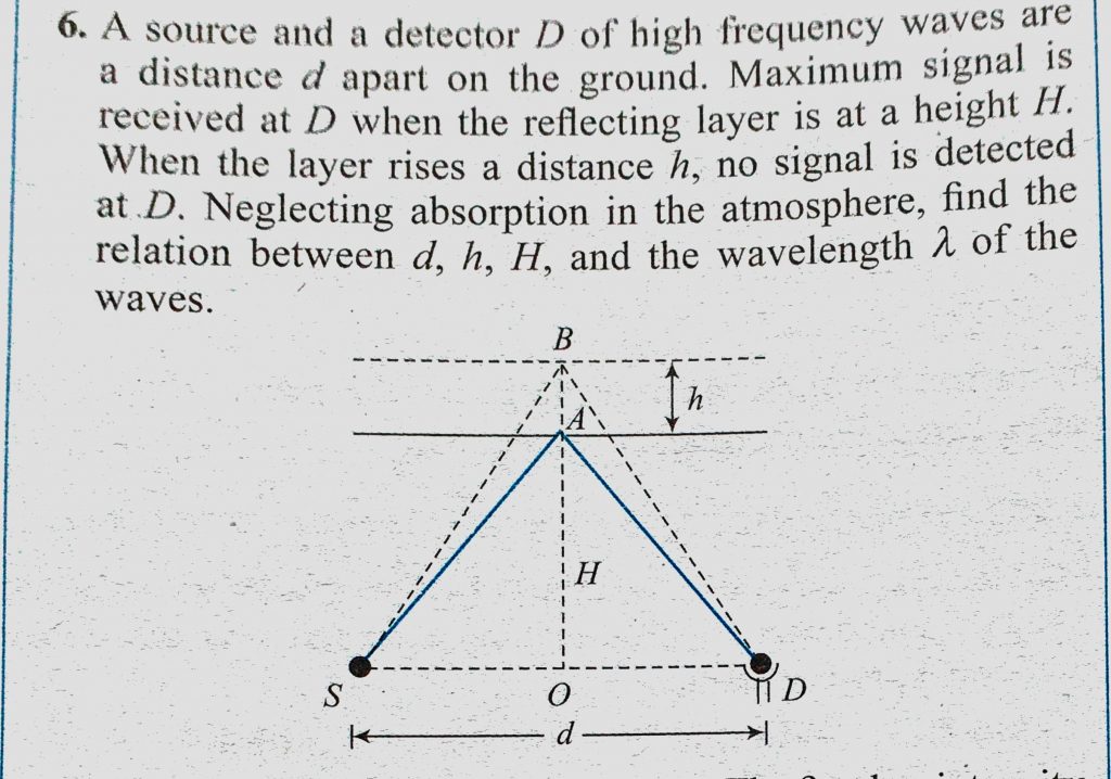 A source and a detector D of high frequency waves are a distance d apart on the ground. Maximum signal is received at D when the reflecting layer is at a height H. When the layer A source and a detector D of high frequency waves are a distance d apart on the ground. Maximum signal is received at D when the reflecting layer is at a height H. When the layer November 5, 2020 Category: Uncategorised (JEE Advanced Physics by BM Sharma + GMP Solutions) , Facebook Messenger WhatsApp Share this:TwitterFacebook Related
