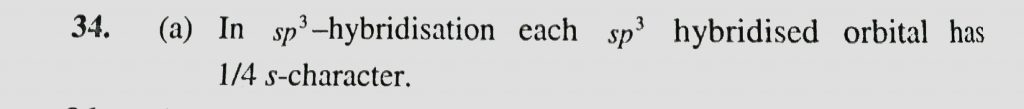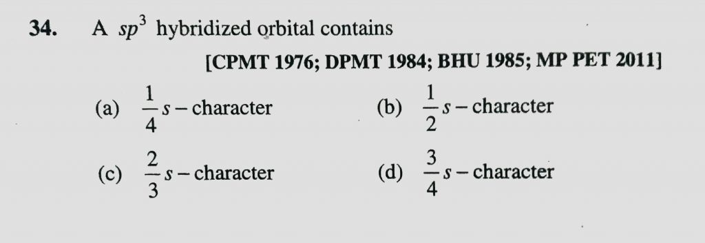 A sp^3 hybridized orbital contains (a) 1/4 s – character (b) 1/2 s – character (c) 2/3 s- character (d) 3/4 s – character A sp^3 hybridized orbital contains (a) 1/4 s - character (b) 1/2 s - character (c) 2/3 s- character (d) 3/4 s - character December 6, 2020 Category: Uncategorised (JEE Advanced Physics by BM Sharma + GMP Solutions) , Facebook Messenger WhatsApp Share this:TwitterFacebook Related