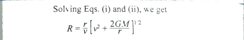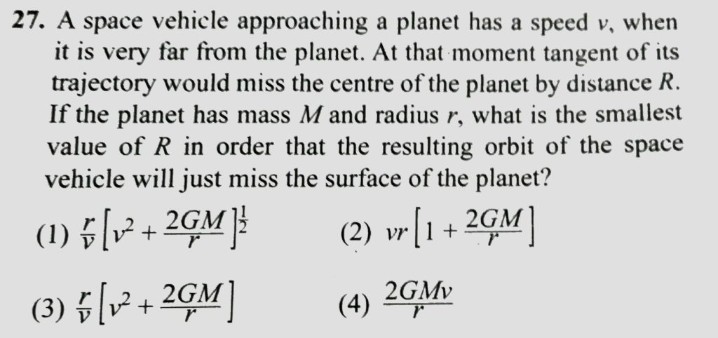 A space vehicle approaching a planet has a speed v, when it is very far from the planet. At that moment tangent of its trajectory would miss the centre of the planet by distance R. If the planet has mass M and radius r, what is the smallest value of R in order that the resulting orbit of the space vehicle will just miss the surface of the planet?