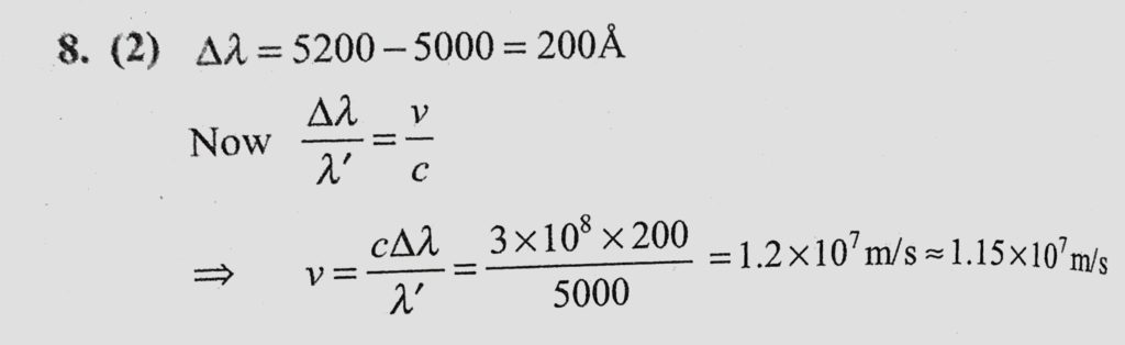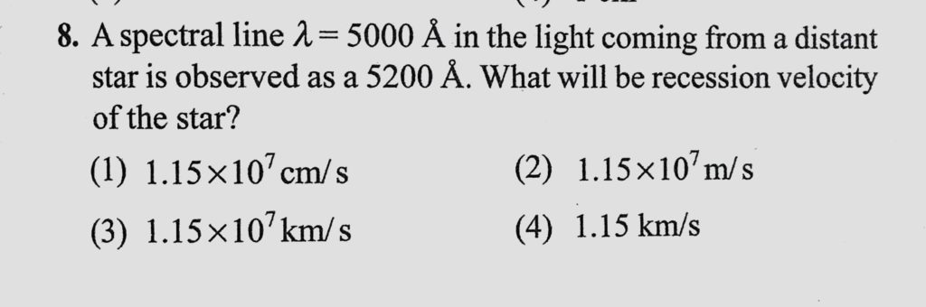 A spectral line lemda = 5000 A in the light coming from a distant star is observed as a 5200 A. What will be recession velocity of the star? A spectral line lemda = 5000 A in the light coming from a distant star is observed as a 5200 A. What will be recession velocity of the star? October 11, 2020 Category: Uncategorised (JEE Advanced Physics by BM Sharma + GMP Solutions) , Facebook Messenger WhatsApp Share this:TwitterFacebook Related