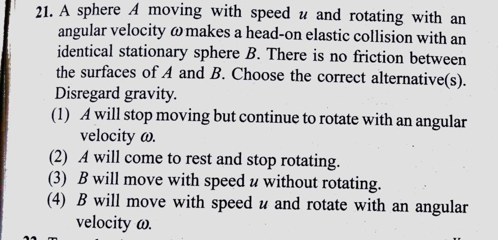 A sphere A moving with a speed u and rotating with an angular velocity ω, makes a head-on elastic collision with an identical stationary sphere B. There is no friction between the surface of A and B. Disregard gravity. A sphere A moving with a speed u and rotating with an angular velocity ω makes a head-on elastic collision with an identical stationary sphere B. There is no friction between the surface of A and B. Disregard gravity. September 30, 2020 Category: Uncategorised (JEE Advanced Physics by BM Sharma + GMP Solutions) , Facebook Messenger WhatsApp Share this:TwitterFacebook Related