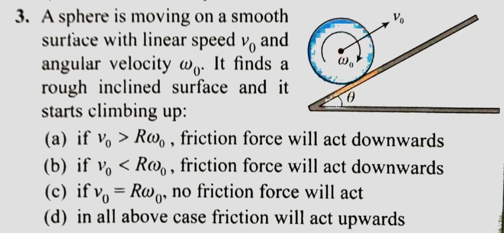 A sphere is moving on a smooth surface with linear speed v0 and angular velocity ω0. It finds a rough inclined surface and it starts climbing up: A sphere is moving on a smooth surface with linear speed v0 and angular velocity ω0. It finds a rough inclined surface and it starts climbing up: September 29, 2020 Category: Uncategorised (JEE Advanced Physics by BM Sharma + GMP Solutions) , Facebook Messenger WhatsApp Share this:TwitterFacebook Related