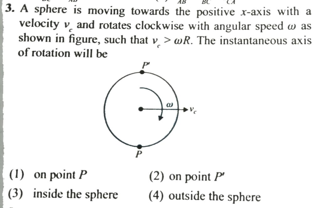 A sphere is moving towards the positive x-axis with a velocity vc and rotates clockwise with angular speed ω shown in Fig. such that vc>ωR. The instantaneous axis of rotation will be A sphere is moving towards the positive x-axis with a velocity vc and rotates clockwise with angular speed ω shown in Fig. such that vc>ωR. The instantaneous axis of rotation will be September 25, 2020 Category: Uncategorised (JEE Advanced Physics by BM Sharma + GMP Solutions) , Facebook Messenger WhatsApp Share this:TwitterFacebook Related