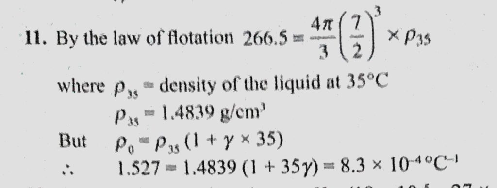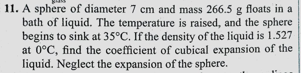 A sphere of diameter 7 cm and mass 266.5 g floats in a bath of liquid. The temperature is raised, and the sphere begins to sink at 35 C . If the density of the liquid is 1.527 at 0 C, A sphere of diameter 7 cm and mass 266.5 g floats in a bath of liquid. The temperature is raised and the sphere begins to sink at 35 C . If the density of the liquid is 1.527 at 0 C October 23, 2020 Category: Uncategorised (JEE Advanced Physics by BM Sharma + GMP Solutions) , Facebook Messenger WhatsApp Share this:TwitterFacebook Related