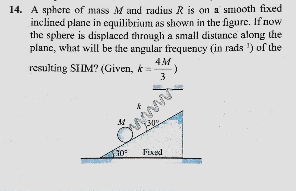 A sphere of mass M and radius R is on a smooth fixed inclined plane in equilibrium as shown in the figure. If now the sphere is displaced through a small distance along the plane, A sphere of mass M and radius R is on a smooth fixed inclined plane in equilibrium as shown in the figure. If now the sphere is displaced through a small distance along the plane October 31, 2020 Category: Uncategorised (JEE Advanced Physics by BM Sharma + GMP Solutions) , Facebook Messenger WhatsApp Share this:TwitterFacebook Related