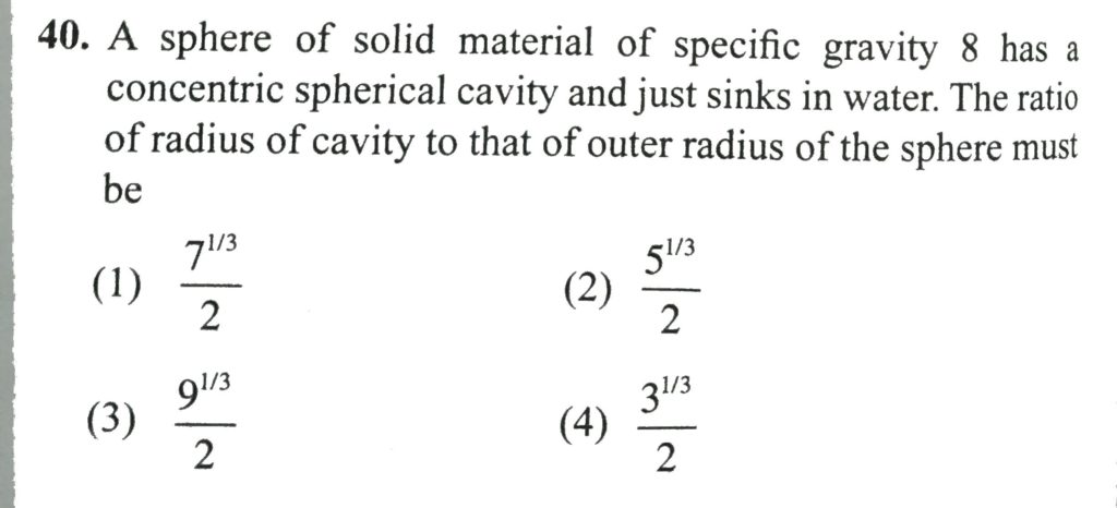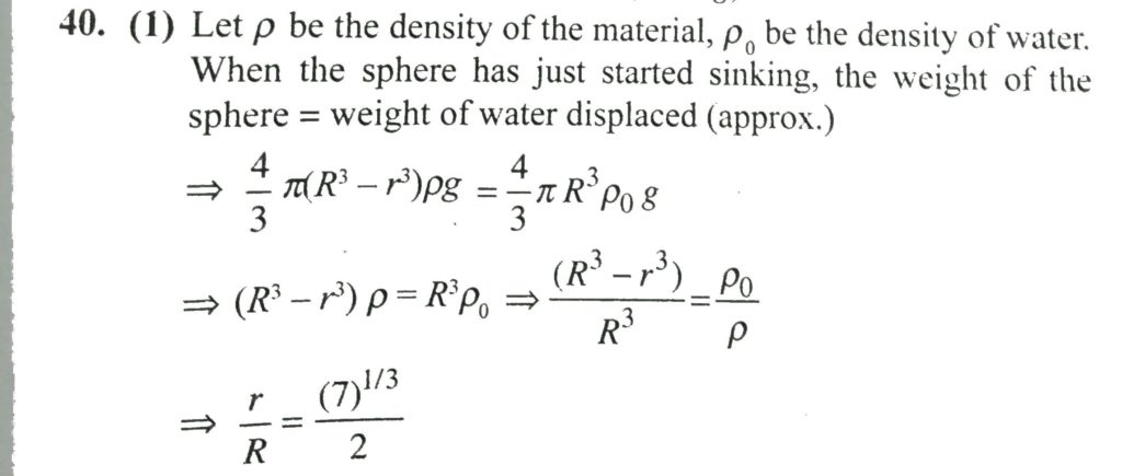 A sphere of solid material of specific gravity 8 has a concentric spherical cavity and just sinks in water. The ratio of radius of cavity to that of outer of the sphere must be A sphere of solid material of specific gravity 8 has a concentric spherical cavity and just sinks in water. The ratio of radius of cavity to that of outer of the sphere must be October 7, 2020 Category: Uncategorised (JEE Advanced Physics by BM Sharma + GMP Solutions) , Facebook Messenger WhatsApp Share this:TwitterFacebook Related