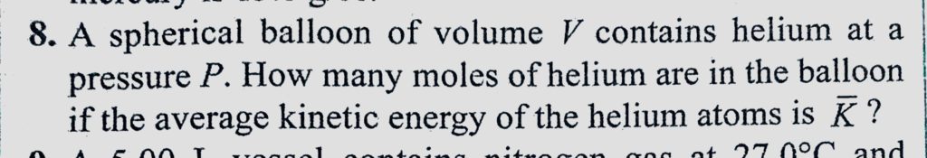 A spherical balloon of volume V contains helium at a pressure P. How many moles of helium are in the balloon if the average kinetic energy of the helium atoms is K ? A spherical balloon of volume V contains helium at a pressure P. How many moles of helium are in the balloon if the average kinetic energy of the helium atoms is K ? October 27, 2020 Category: Uncategorised (JEE Advanced Physics by BM Sharma + GMP Solutions) , Facebook Messenger WhatsApp Share this:TwitterFacebook Related