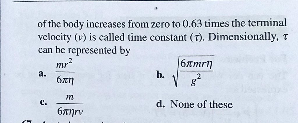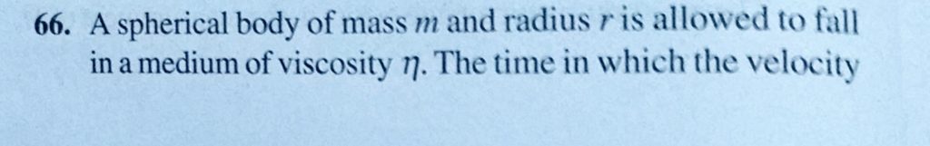 A spherical body of mass m and radius r is allowed to fall in a medium of viscosity n. The time in which the velocity of the body increases from zero to 0.63 times the terminal velocity (v) is called time constant If x and a stand for distance then for what value of n is the given equation dimensionally correct? The equation is September 15, 2020 Category: Uncategorised (JEE Advanced Physics by BM Sharma + GMP Solutions) , Facebook Messenger WhatsApp Share this:TwitterFacebook Related