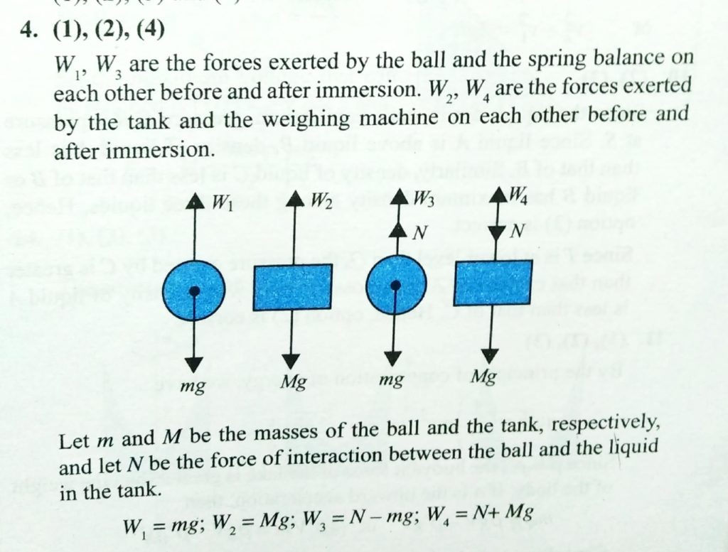 A spring balance reads W1 when a ball is suspended from it. A weighing machine reads W2 when a tank of liquid is kept on it. When the ball is immersed in the liquid, the spring balance reads W3 and the weighing machine reads W4. Then, which of the following are not correct?