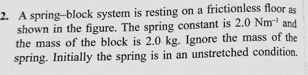 A spring-block system is resting on a frictionless floor as shown in the figure. The spring constant is 2.0 N/m and the mass of the block is 2.0 kg. Ignore the mass of the spring. A spring-block system is resting on a frictionless floor as shown in the figure. The spring constant is 2.0 N/m and the mass of the block is 2.0 kg. Ignore the mass of the spring. November 1, 2020 Category: Uncategorised (JEE Advanced Physics by BM Sharma + GMP Solutions) , Facebook Messenger WhatsApp Share this:TwitterFacebook Related