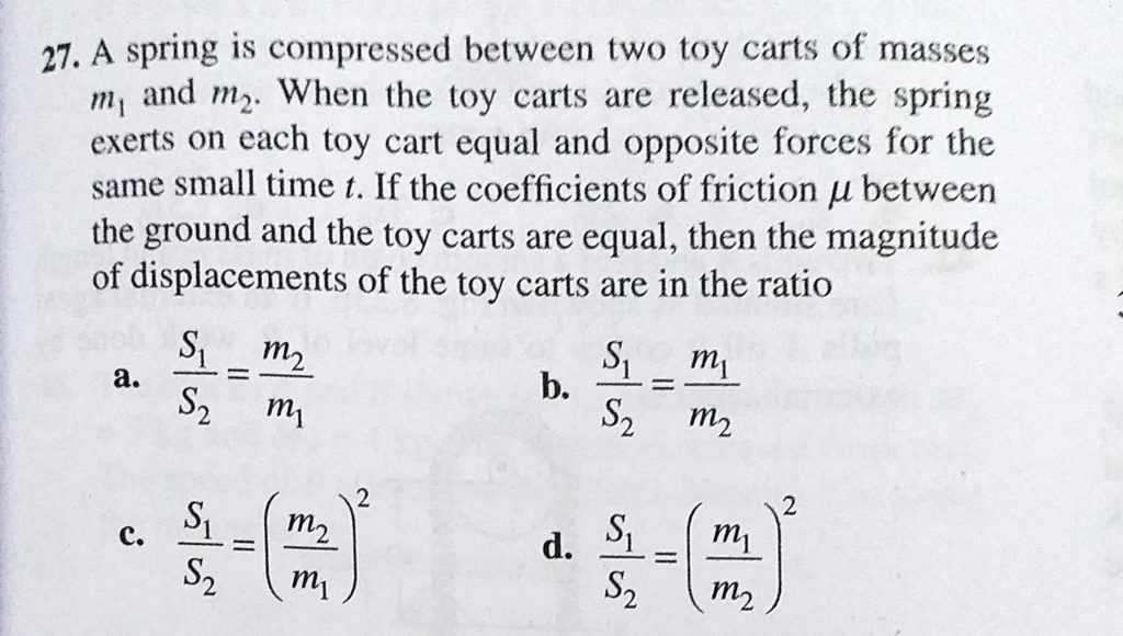 A spring is compressed between two toy carts of masses m1 and m2. When the toy carts are released, the spring exerts on each toy cart equal and opposite forces for the same small time t. A spring is compressed between two toy carts of masses m1 and m2. When the toy carts are released the spring exerts on each toy cart equal and opposite forces for the same small time t. October 3, 2020 Category: Uncategorised (JEE Advanced Physics by BM Sharma + GMP Solutions) , Facebook Messenger WhatsApp Share this:TwitterFacebook Related