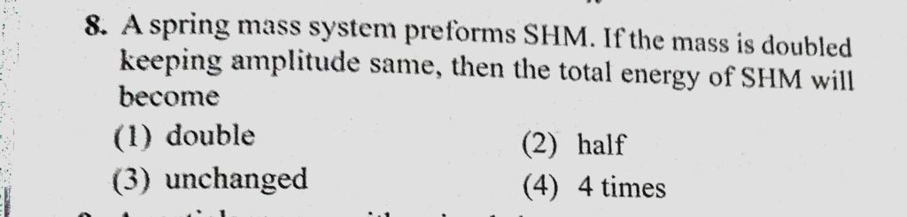 A spring mass system performs SHM. If the mass is doubled keeping amplitude same, then the total energy of SHM will become A spring mass system performs SHM. If the mass is doubled keeping amplitude same then the total energy of SHM will become October 30, 2020 Category: Uncategorised (JEE Advanced Physics by BM Sharma + GMP Solutions) , Facebook Messenger WhatsApp Share this:TwitterFacebook Related
