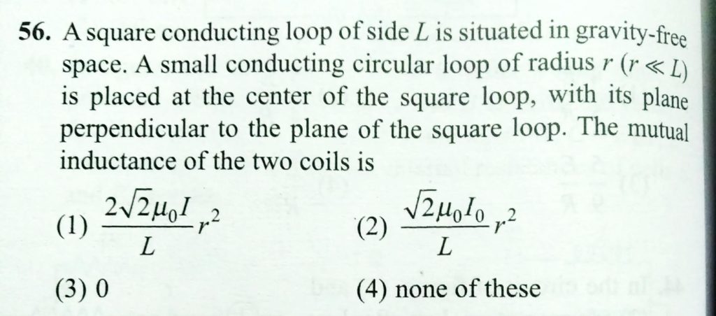 A square conducting loop of side L is situated in gravity free space. A small conducting circular loop of radius r ( r < < L) is placed at the center of the square loop, with its plane perpendicular to the plane of the square loop. The mutual inductance of the two coils is
