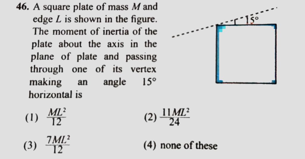 A square plate of mass M and edge L is shown in figure. Find the moment of inertia of the plate about the axis in the plane of plate passing through one of its vertex making an angle 15 0 from horizontal. A uniform rod of length l is placed symmetrically on two walls as shown in figure. The rod is in equilibrium. If N1 and N 2 are the normal forces exerted by the walls on the rod then: September 26, 2020 Category: Uncategorised (JEE Advanced Physics by BM Sharma + GMP Solutions) , Facebook Messenger WhatsApp Share this:TwitterFacebook Related
