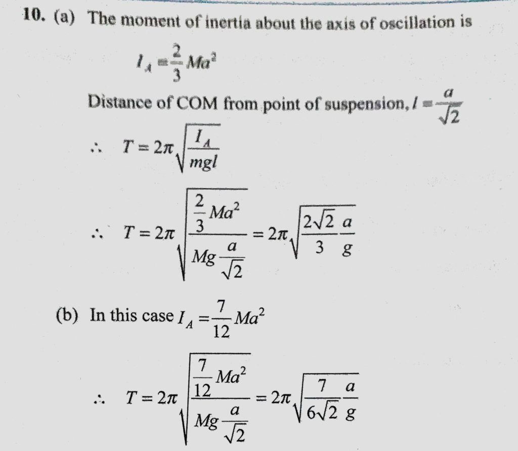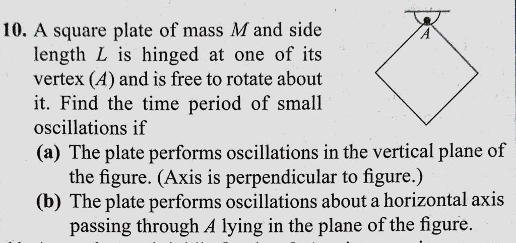 A square plate of mass M and side length L is hinged at one of its vertex (a) and is free to rotate about it. Find the time period of small oscillation if (1) The plate performs oscillations in A square plate of mass M and side length L is hinged at one of its vertex (a) and is free to rotate about it. Find the time period of small oscillation if (1) The plate performs oscillations in October 30, 2020 Category: Uncategorised (JEE Advanced Physics by BM Sharma + GMP Solutions) , Facebook Messenger WhatsApp Share this:TwitterFacebook Related