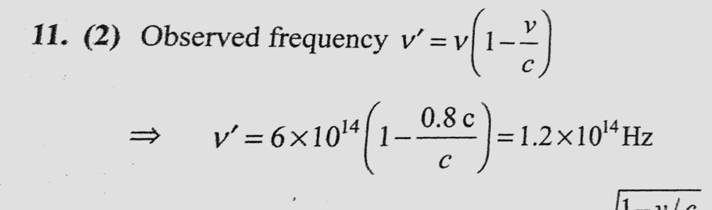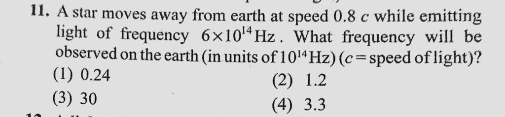 A star moves away from earth at speed 0.8 c while emitting light of frequency 6 *10^14 Hz. What frequency will be observed on the earth ( in units of 10^14 Hz) A star moves away from earth at speed 0.8 c while emitting light of frequency 6 *10^14 Hz. What frequency will be observed on the earth ( in units of 10^14 Hz) October 11, 2020 Category: Uncategorised (JEE Advanced Physics by BM Sharma + GMP Solutions) , Facebook Messenger WhatsApp Share this:TwitterFacebook Related