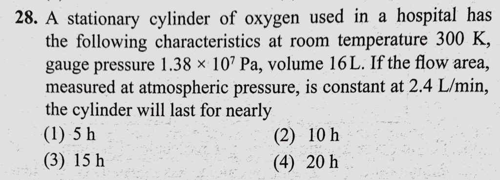 A stationary cylinder of oxygen used in a hospital has the following characteristics at room temperature 300K, gauge pressure 1.38 * 10^7 Pa, volume 16 L. If the flow area, measured A stationary cylinder of oxygen used in a hospital has the following characteristics at room temperature 300K gauge pressure 1.38 * 10^7 Pa measured volume 16 L. If the flow area October 27, 2020 Category: Uncategorised (JEE Advanced Physics by BM Sharma + GMP Solutions) , Facebook Messenger WhatsApp Share this:TwitterFacebook Related