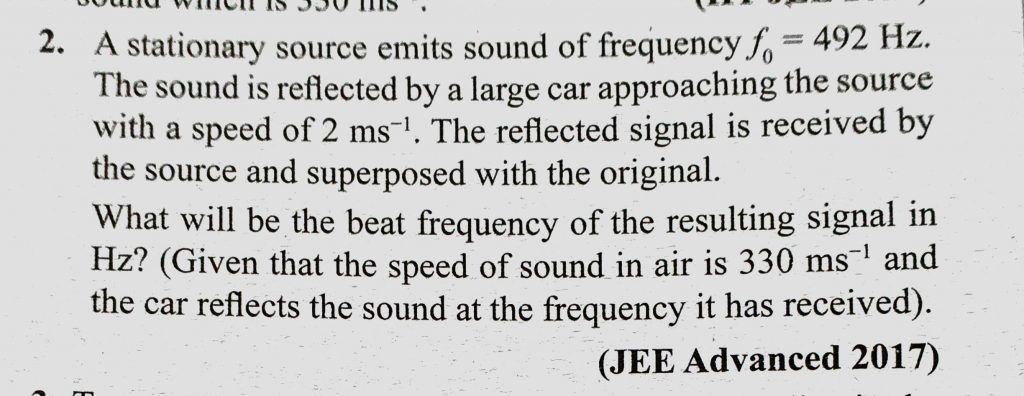 A stationary source emits sound of frequency f0 = 492 Hz. The sound is reflected by a large car approaching the source with a speed of 2 m/s. The reflected signal is received by A stationary source emits sound of frequency f0 = 492 Hz. The sound is reflected by a large car approaching the source with a speed of 2 m/s. The reflected signal is received by November 8, 2020 Category: Uncategorised (JEE Advanced Physics by BM Sharma + GMP Solutions) , Facebook Messenger WhatsApp Share this:TwitterFacebook Related