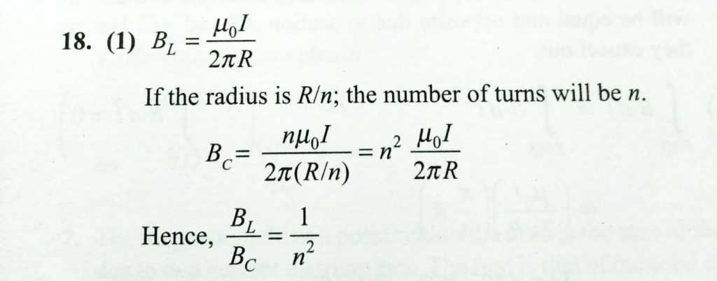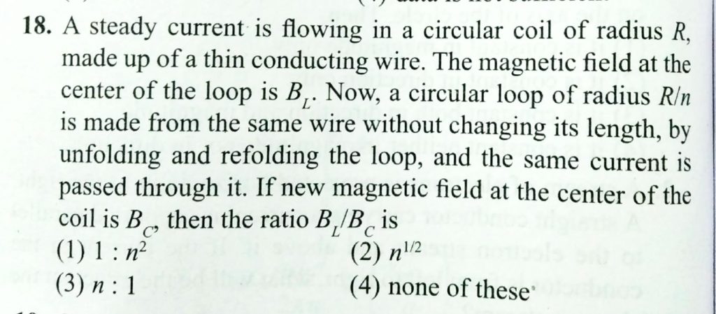A steady current is flowing in a circular coil of radius R, made up of a thin conducting wire. The magnetic field at the centre of the loop is BL. Now, a circular loop of radius R/n is made from the same wire without changing its length, by unfounding and refolding the loop, and the same current is passed through it. If new magnetic field at the centre of the coil is BC, then the ratio BL/BC is