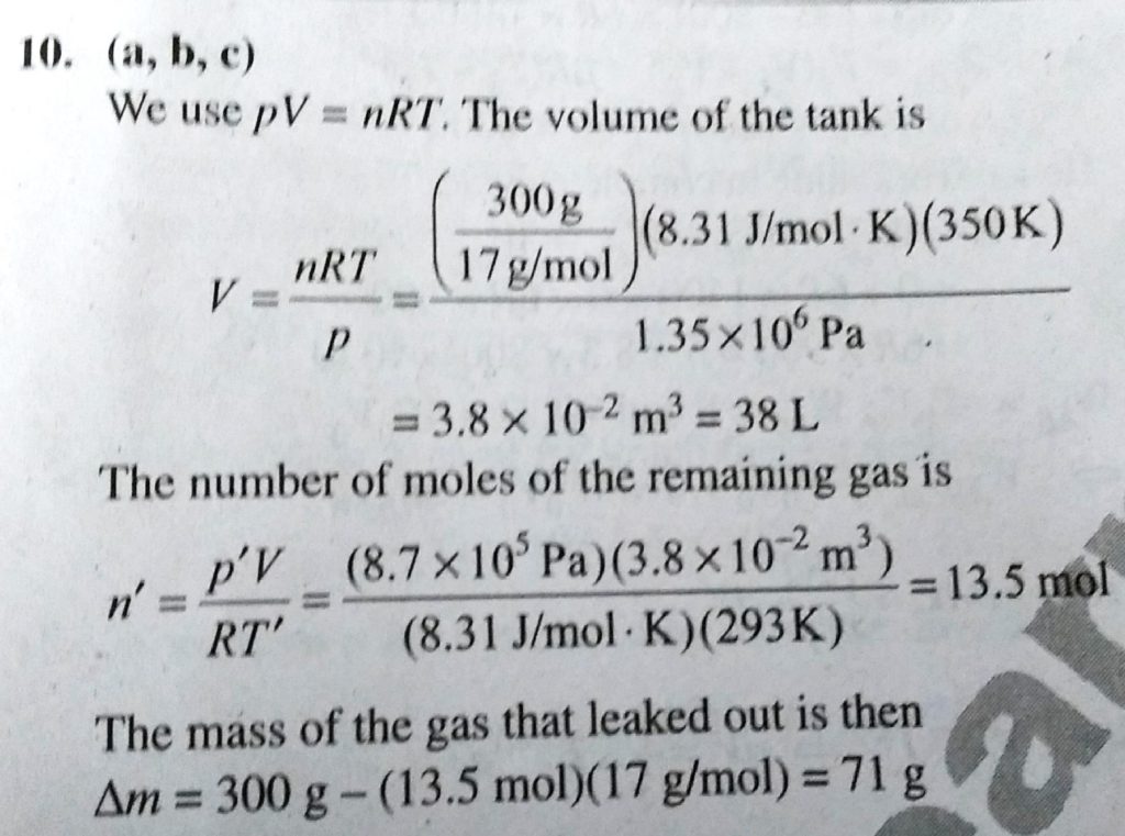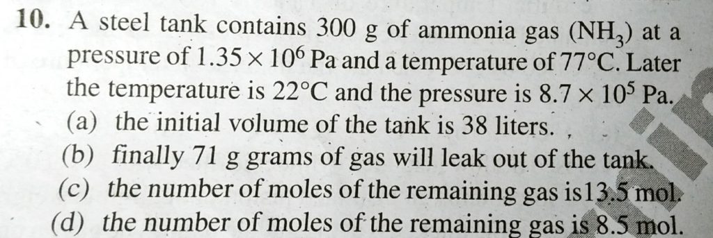 A steel tamks contains 300 g of amonia gas ( NH3) at a pressure 1.35 x 10^6 Pa and a temperature of 77 degree C. Later the temperature is 22 degree C and the pressure is 8.7 x 10^5 Pa. A steel tamks contains 300 g of amonia gas ( NH3) at a pressure 1.35 x 10^6 Pa and a temperature of 77 degree C. Later the temperature is 22 degree C and the pressure is 8.7 x 10^5 Pa. October 5, 2020 Category: Uncategorised (JEE Advanced Physics by BM Sharma + GMP Solutions) , Facebook Messenger WhatsApp Share this:TwitterFacebook Related