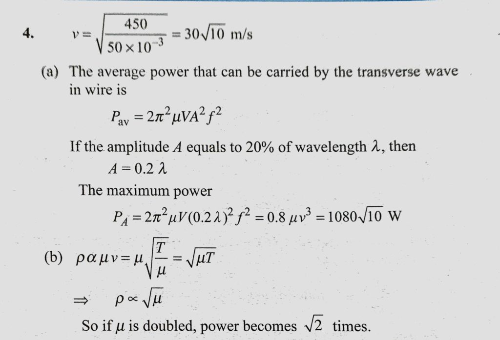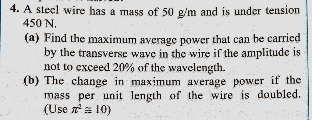 A steel wire has a mass of 50 g/m and is under tension 450 N. (a) Find the maximum average power that can be carried by the transverse wave in the wire if the amplitude is not to A steel wire has a mass of 50 g/m and is under tension 450 N. (a) Find the maximum average power that can be carried by the transverse wave in the wire if the amplitude is not to November 1, 2020 Category: Uncategorised (JEE Advanced Physics by BM Sharma + GMP Solutions) , Facebook Messenger WhatsApp Share this:TwitterFacebook Related