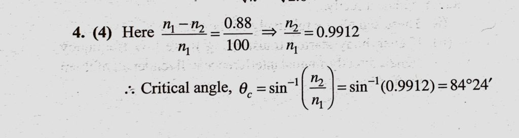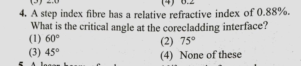 A step index fibre has a relative refractive index of 0.88%. What is the critical angle at the corecladding interface ? A step index fibre has a relative refractive index of 0.88%. What is the critical angle at the corecladding interface ? October 22, 2020 Category: Uncategorised (JEE Advanced Physics by BM Sharma + GMP Solutions) , Facebook Messenger WhatsApp Share this:TwitterFacebook Related