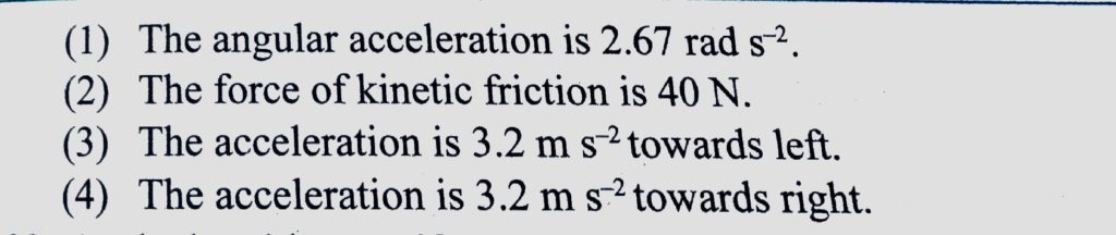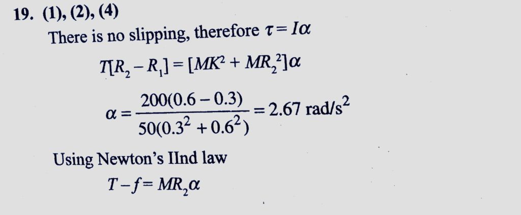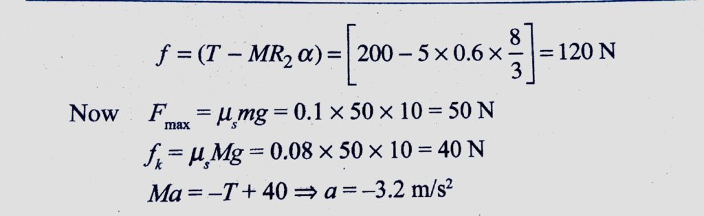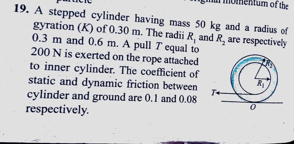 A stepped cylinder having mass 50 kg and a radius of gyration (K) of 0.30 m. The radii R1 and R2 are respectively 0.3 m and 0.6 m. A pull T equal to 200N is exerted on the rope attached to inner cylinder. The coefficient of static and dynamic friction between cylinder and ground are 0.1 and 0.08 respectively.