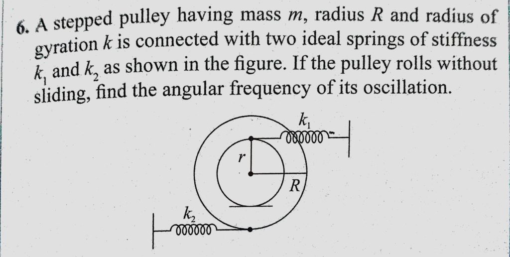 A stepped pulley having mass m, radius R and radius of gyration k is connected with two ideal springs of stiffness k1 and k2 as shown in the figure. If the pulley rolls without A stepped pulley having mass m radius R and radius of gyration k is connected with two ideal springs of stiffness k1 and k2 as shown in the figure. If the pulley rolls without October 30, 2020 Category: Uncategorised (JEE Advanced Physics by BM Sharma + GMP Solutions) , Facebook Messenger WhatsApp Share this:TwitterFacebook Related