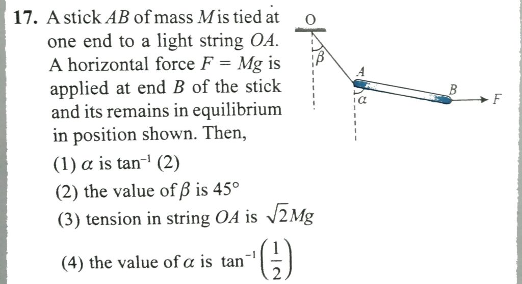 A stick AB of mass M is tied at one end to a light string OA. A horizontal force F = Mg is applies at end B of the stick and its remains in equilibrium in position shown. Then angle ′ α ′ is. A stick AB of mass M is tied at one end to a light string OA. A horizontal force F = Mg is applies at end B of the stick and its remains in equilibrium in position shown. Then angle ′ α ′ is. September 26, 2020 Category: Uncategorised (JEE Advanced Physics by BM Sharma + GMP Solutions) , Facebook Messenger WhatsApp Share this:TwitterFacebook Related