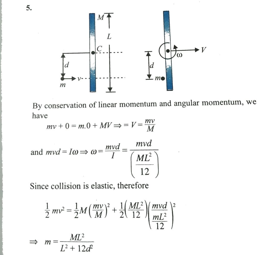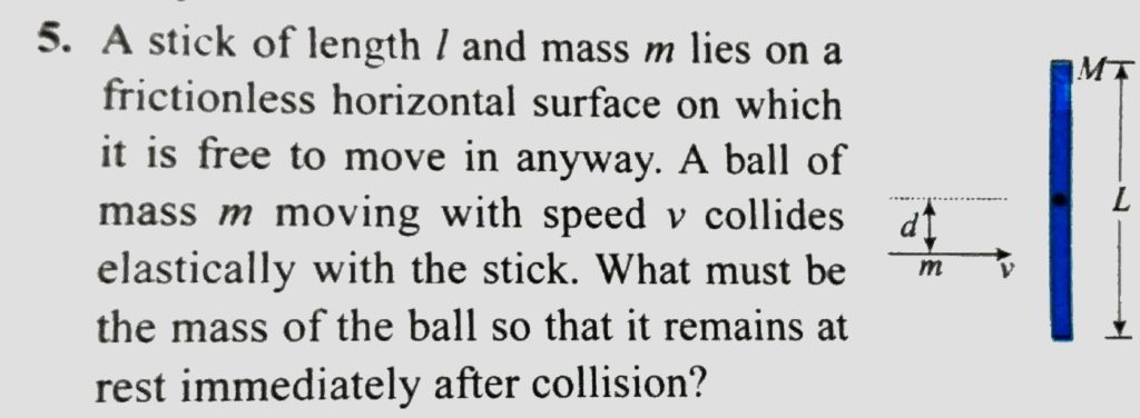 A stick of length L and mass M lies on a frictionless horizontal table on which it is free to move in any way A small particle of mass m moving on the table and perpendicular to the rod collides elastically with the stick with speed v.What must be the mass m in term of M.L and d of the particle so that it is at rest immediately after the collision.