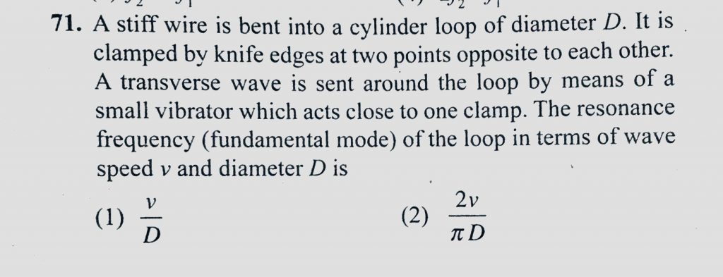 A stiff wire is bent into a cylinder loop of diameter D. It is clamped by knife edges at two points opposite to each other. A transverse wave is sent around the loop by means of a A stiff wire is bent into a cylinder loop of diameter D. It is clamped by knife edges at two points opposite to each other. A transverse wave is sent around the loop by means of a November 6, 2020 Category: Uncategorised (JEE Advanced Physics by BM Sharma + GMP Solutions) , Facebook Messenger WhatsApp Share this:TwitterFacebook Related